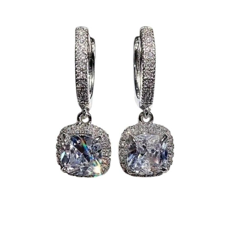 Radiant Ice Cushion Drop Earrings combine classic charm with bold sparkle. Featuring large cushion-cut cubic zirconia stones framed by a halo of micro-pavé crystals, these silver-tone drop earrings radiate elegance and luxury. The delicate hoop base adds subtle texture, making them ideal for evening events, bridal looks, or anytime you crave a touch of sophistication and shine.